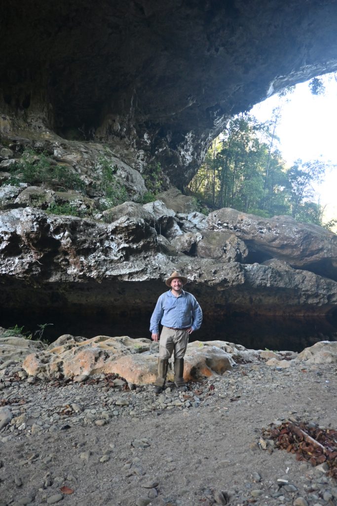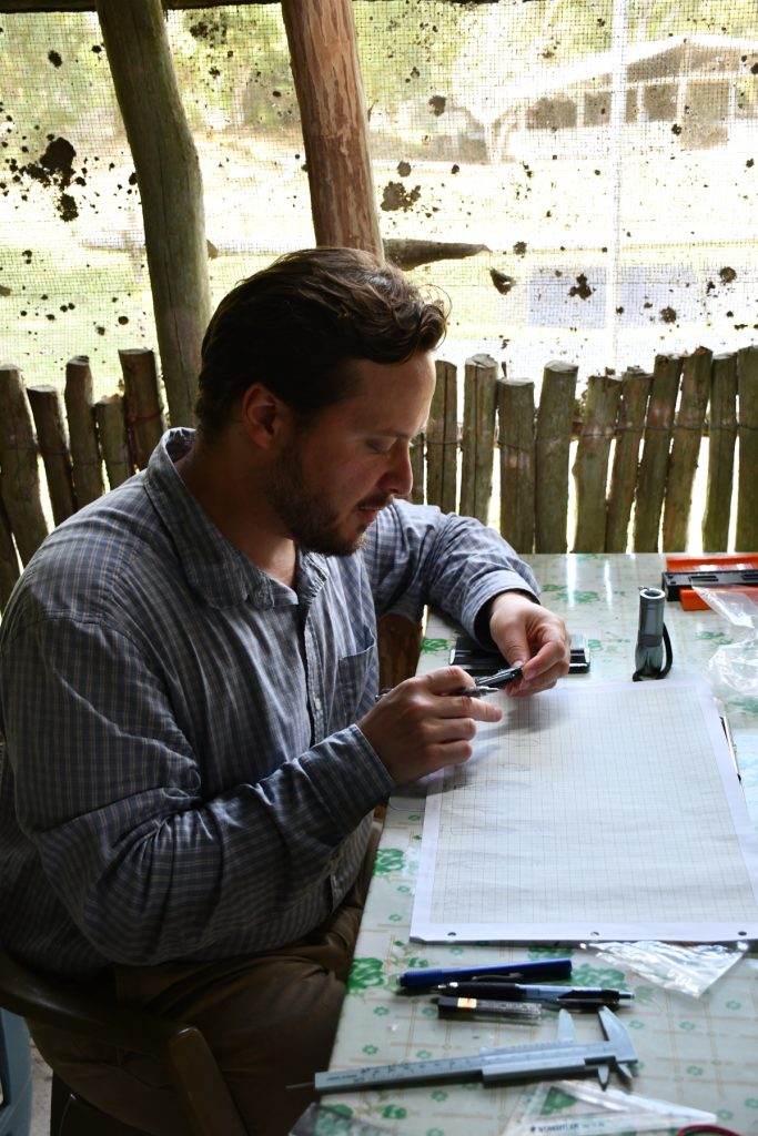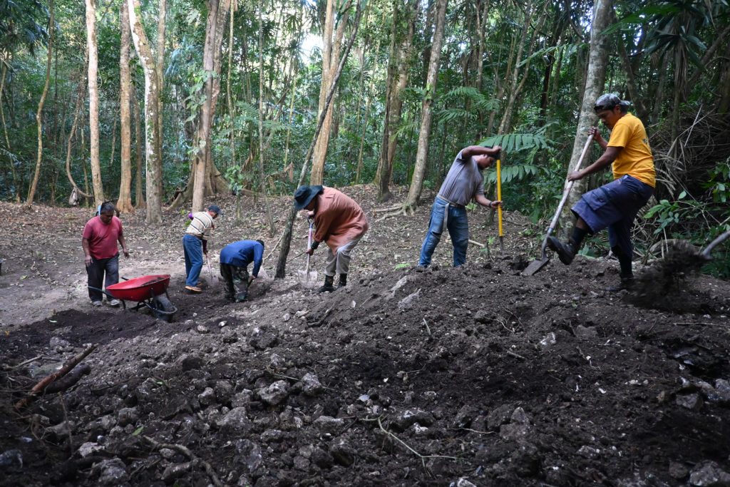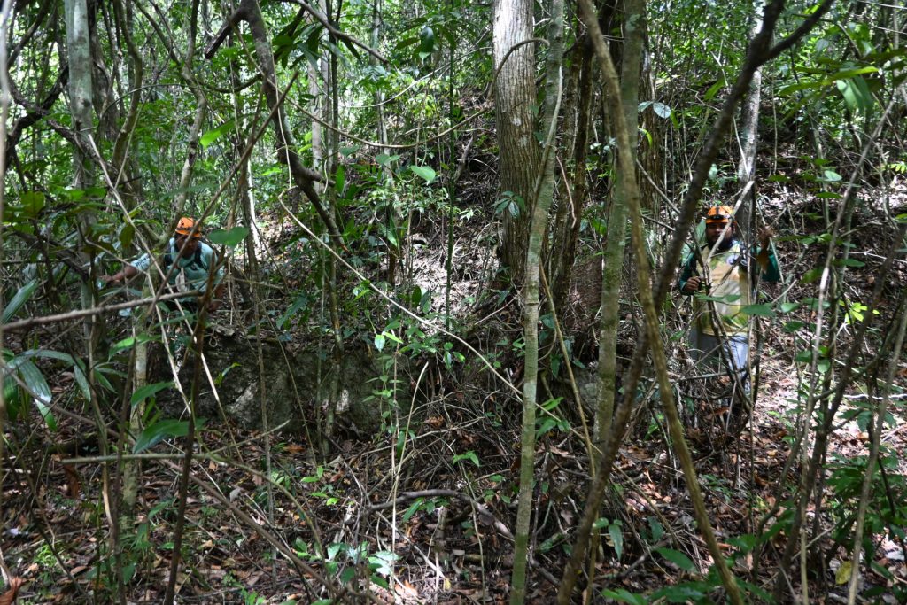 Also on Wednesday, Adrian left with Josue and Andres from the Institute of Archaeology to survey some of the sites found south of Caracol during last year’s lidar campaign. The three of them overnighted at Natural Arch and were able to look over two sites, one on the way to the Arch and one near Natural Arch. They succeeded in finding a host of structures and plazas as well as potential stone monuments. One of the monuments was a face-down stela that once had a height of over 4.5 m. The site around Natural Arch is fairly sizeable with a causeway going down to the river.